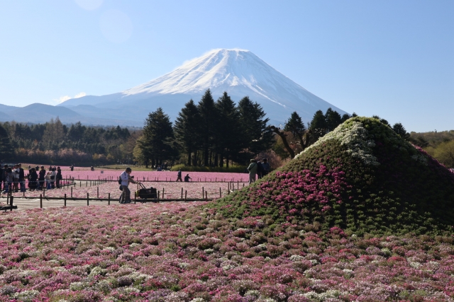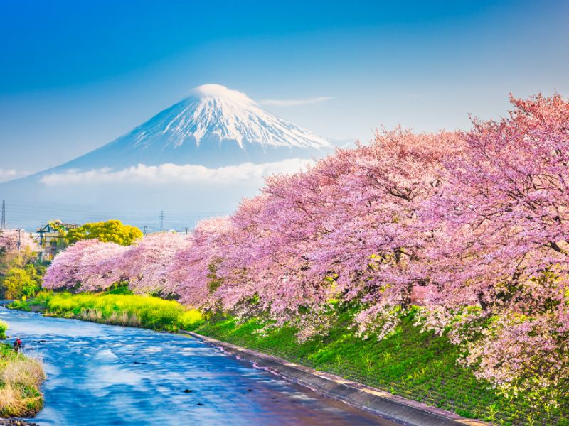 Hay alrededor de 650 cerezos plantados aquí, por lo que en primavera se pueden ver hermosos cerezos en flor y el monte Fuji.