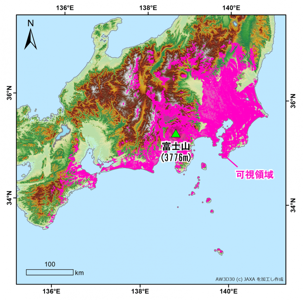 Según las observaciones satelitales, el monte Fuji se puede ver desde el área rosa del mapa.